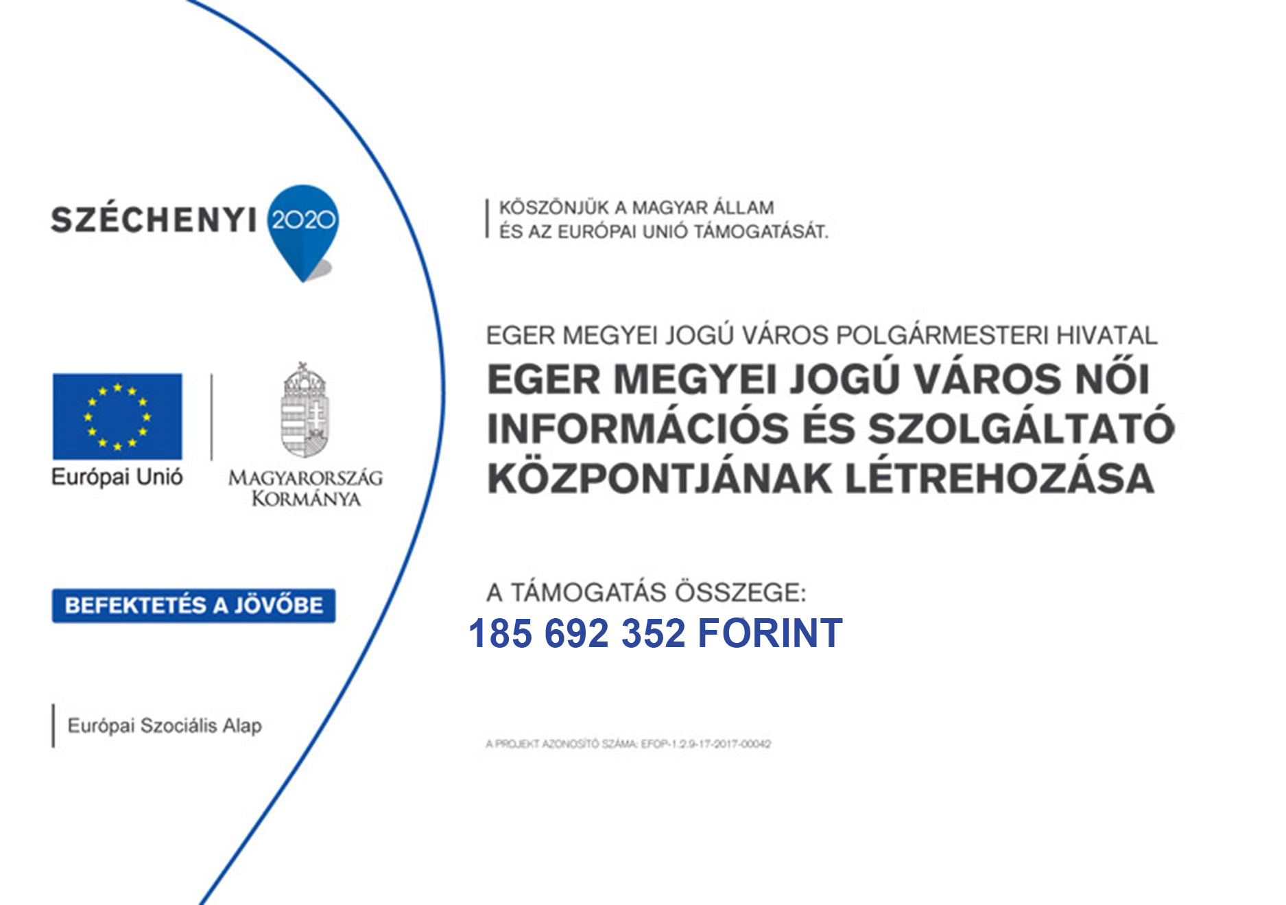Eger 185 692 352 forint európai uniós támogatást kapott az EFOP-1.2.9-17-2017-00042-es azonosítószámú „Eger Megyei Jogú Város Női Információs és Szolgáltató Központjának létrehozása" című projektre. A pályázat beadásában és a projekt megvalósításában konzorciumban együttműködik Eger Megyei Jogú Város Polgármesteri Hivatala és a FICSAK - Fiatal Családosok Klubjának Egyesülete.